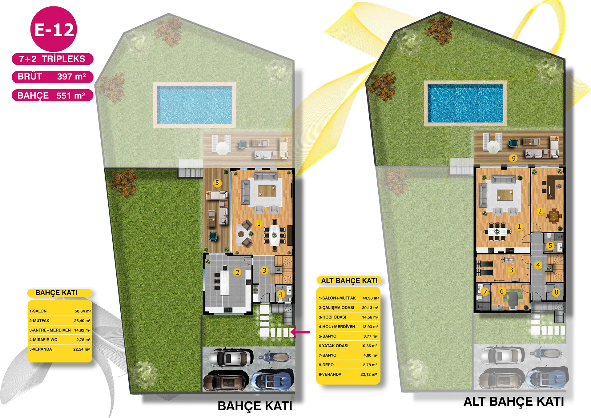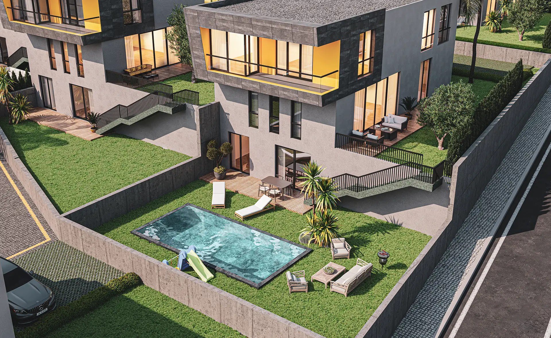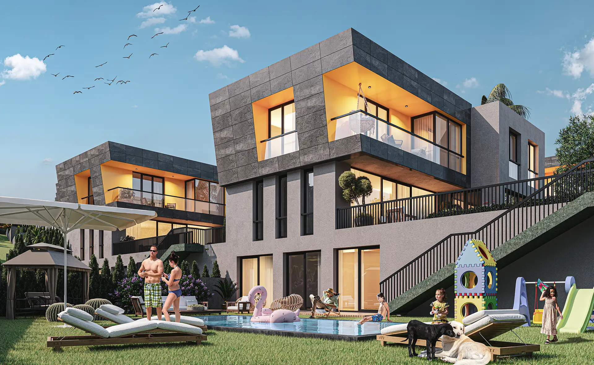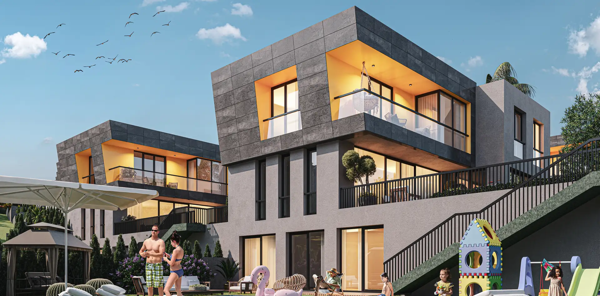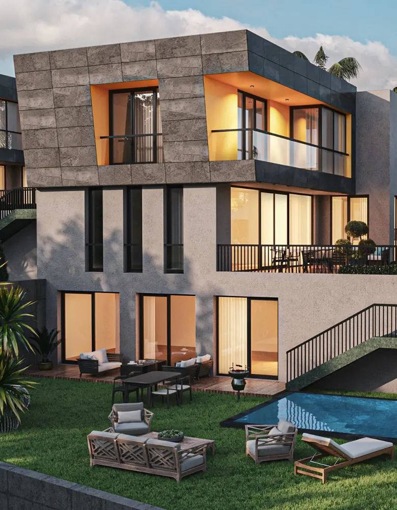 Mimari estetiğin, konforla bir araya geldiği villalarımız, bahçe ve havuz seçenekleri ile size ve ailenize keyifli vakit geçirebilmeniz için bir yaşam alanı sunuyor. Özel bahçe ve havuzun yanı sıra geniş ailelerin tercihi tripleks villalarımızda iki ayrı giriş bulunuyor.