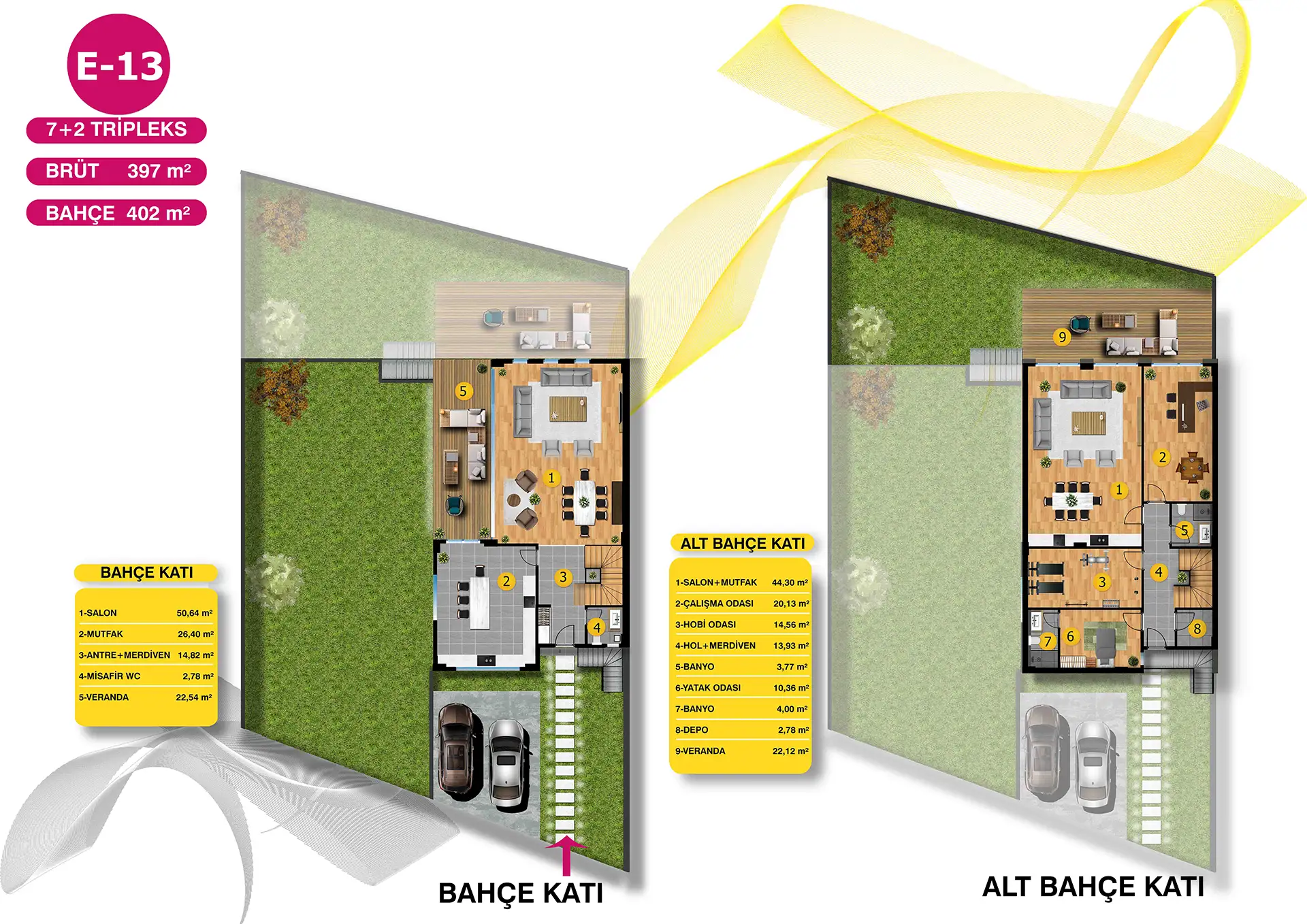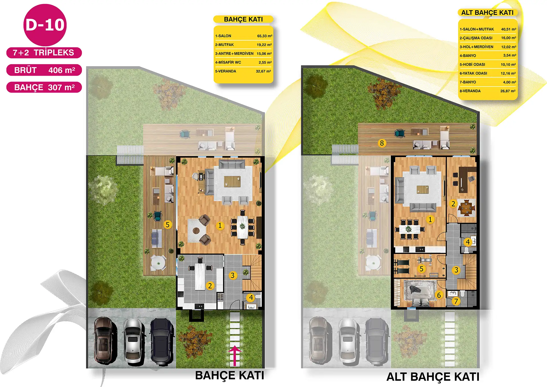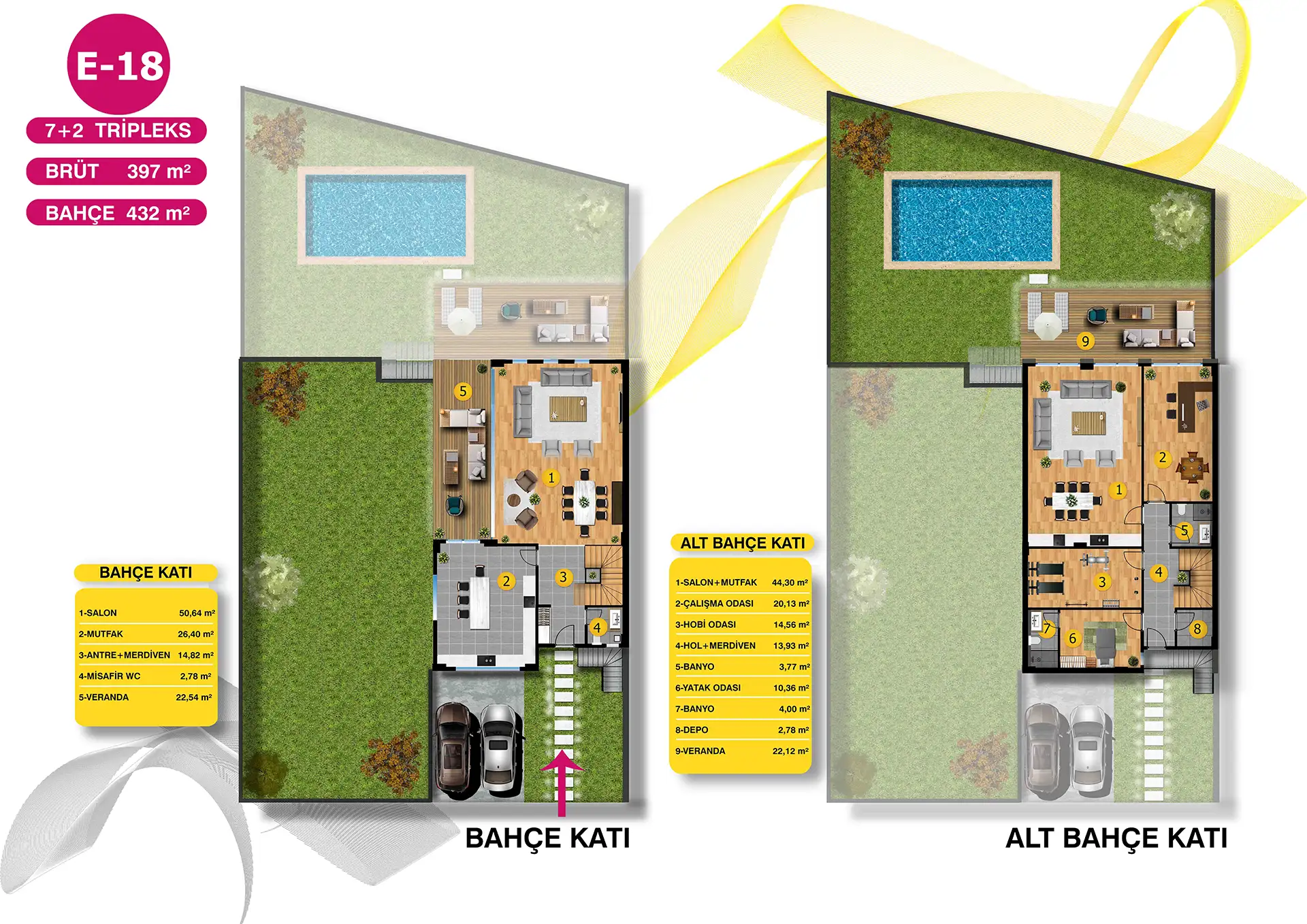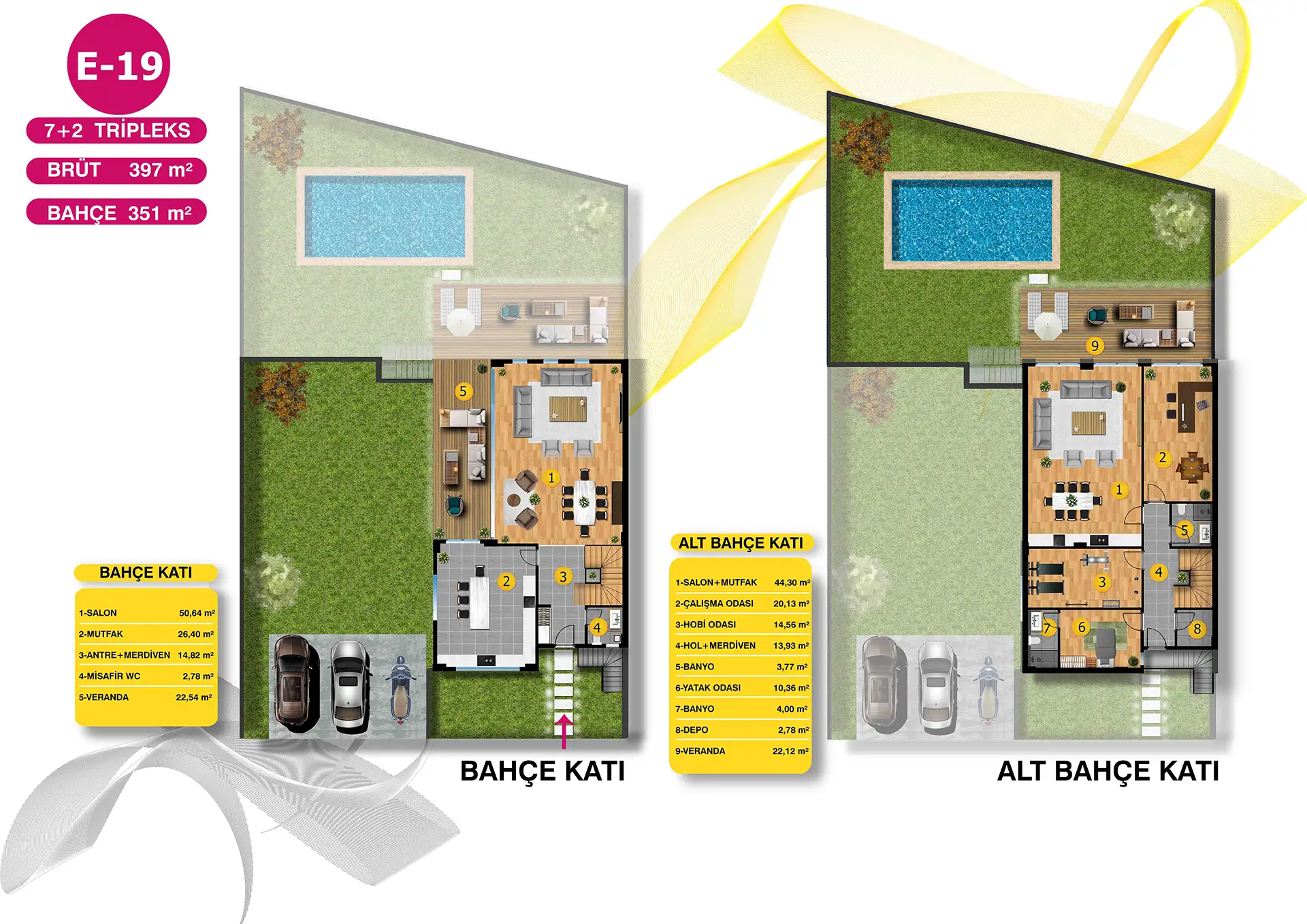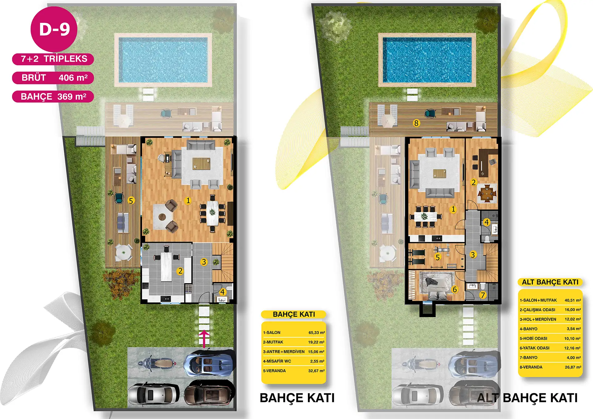 Mimari estetiğin, konforla bir araya geldiği villalarımız, bahçe ve havuz seçenekleri ile size ve ailenize keyifli vakit geçirebilmeniz için bir yaşam alanı sunuyor. Özel bahçe ve havuzun yanı sıra geniş ailelerin tercihi tripleks villalarımızda iki ayrı giriş bulunuyor.