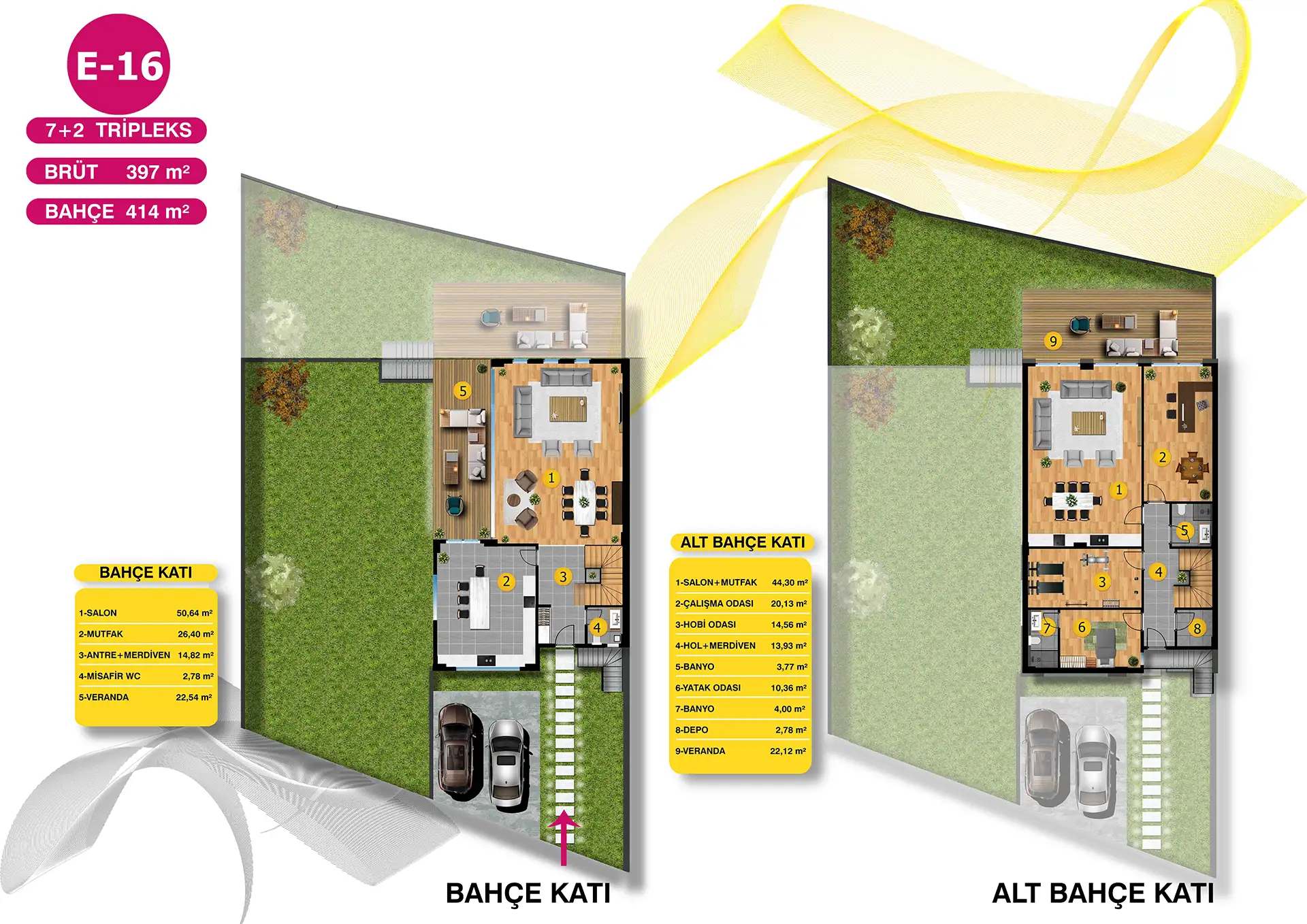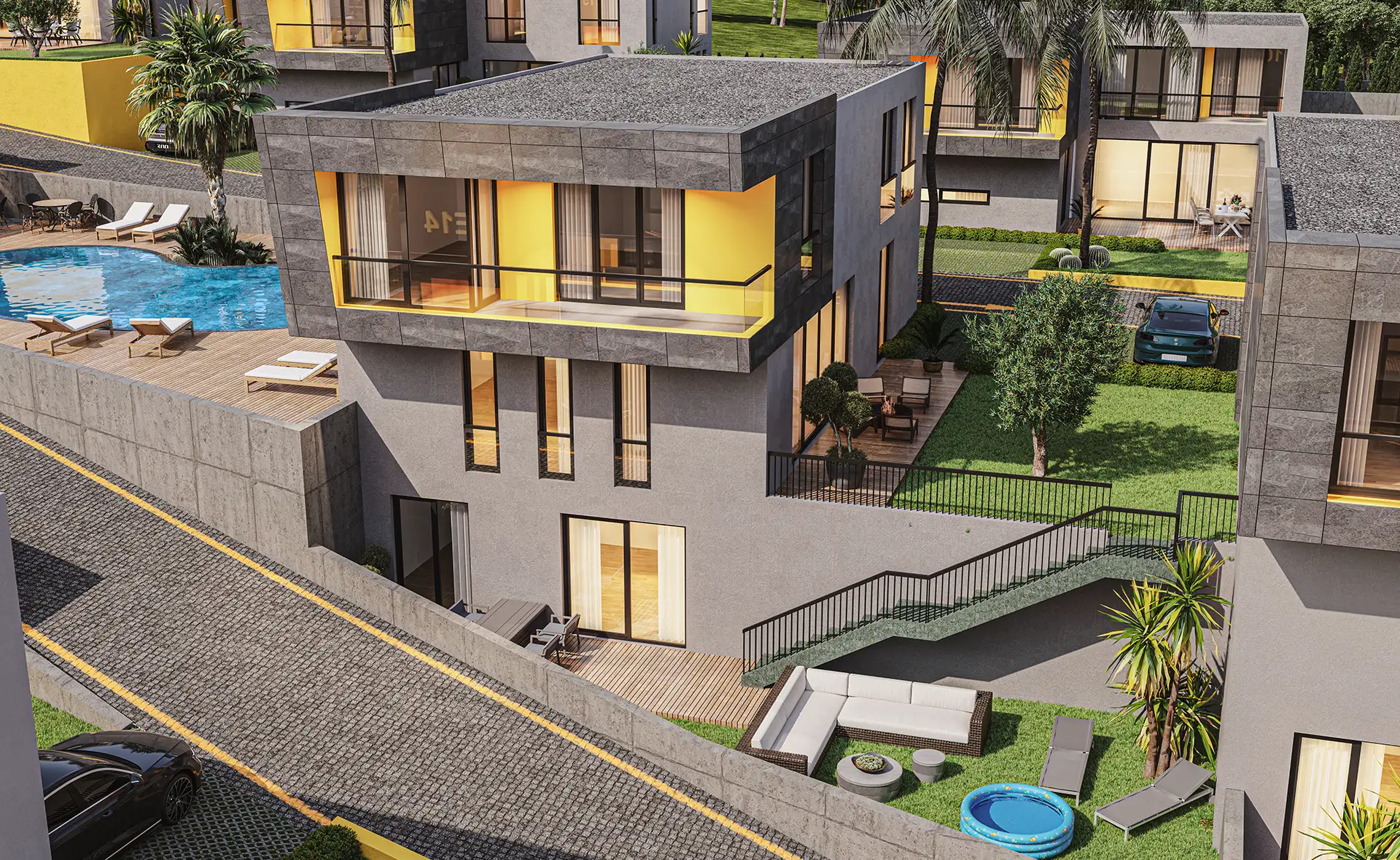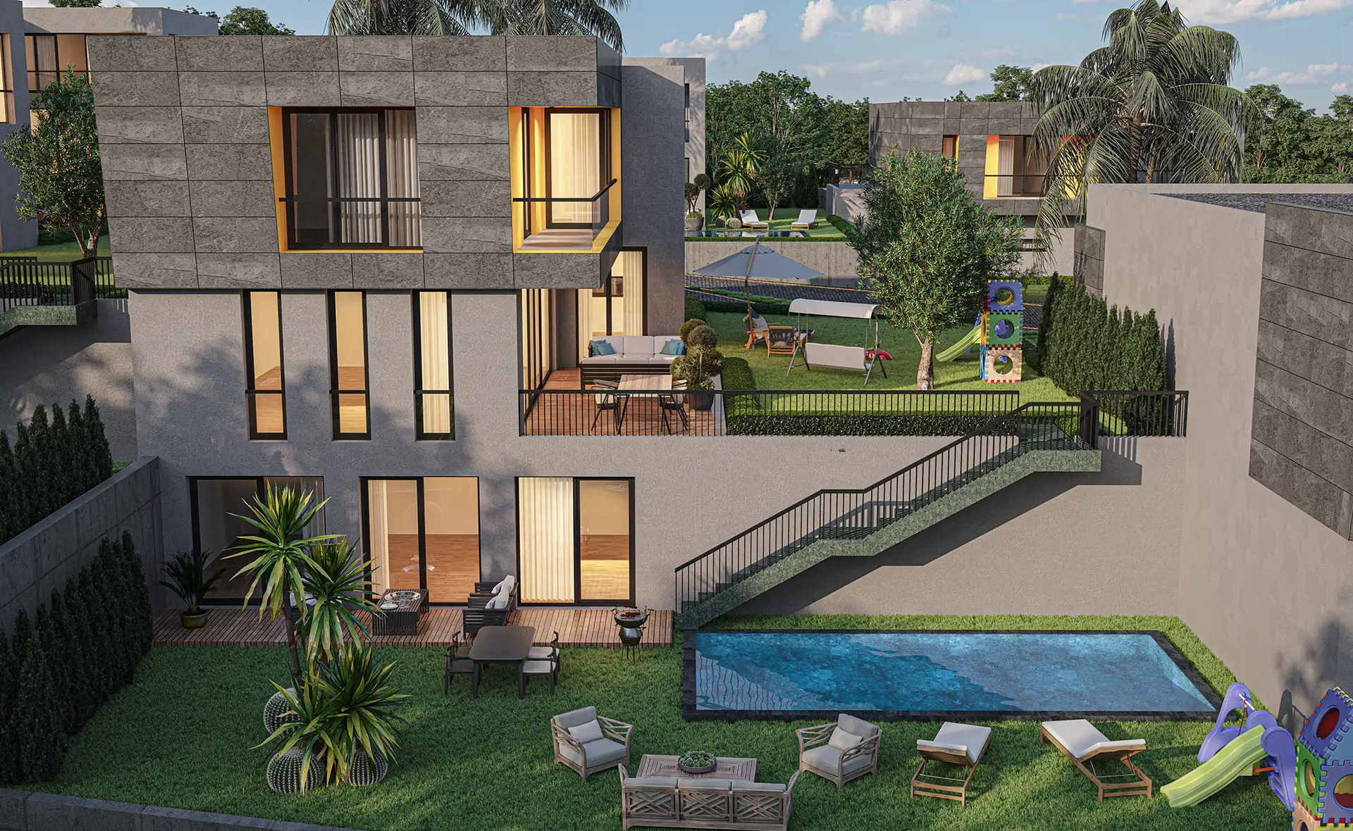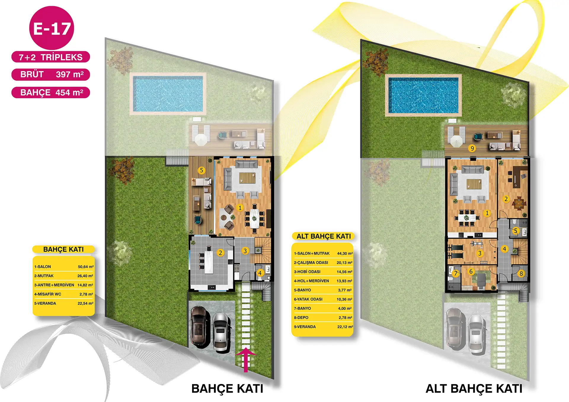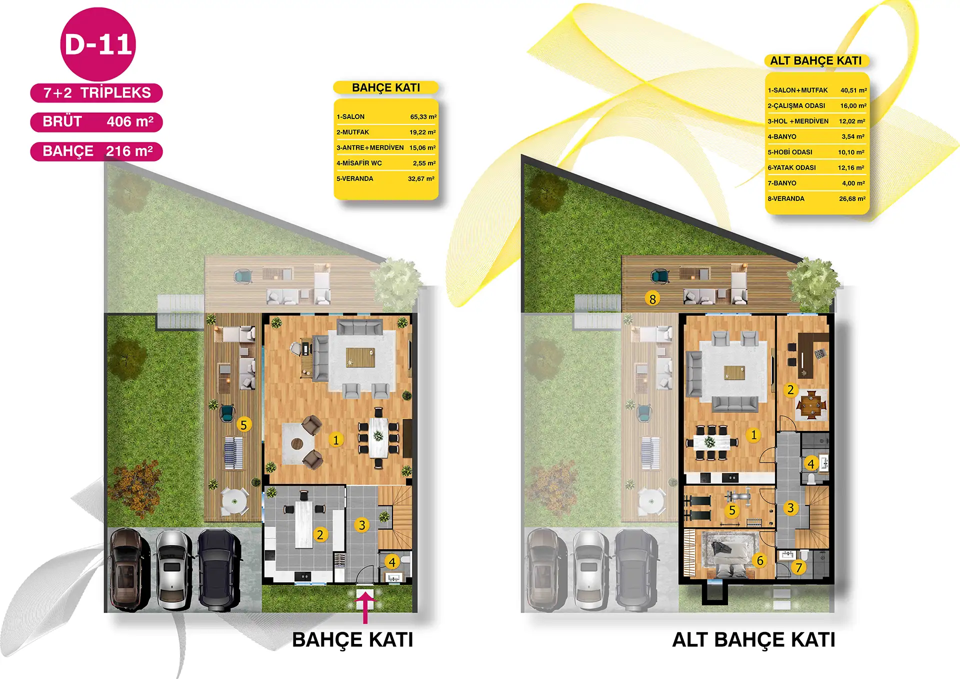 Mimari estetiğin, konforla bir araya geldiği villalarımız, bahçe ve havuz seçenekleri ile size ve ailenize keyifli vakit geçirebilmeniz için bir yaşam alanı sunuyor. Özel bahçe ve havuzun yanı sıra geniş ailelerin tercihi tripleks villalarımızda iki ayrı giriş bulunuyor.