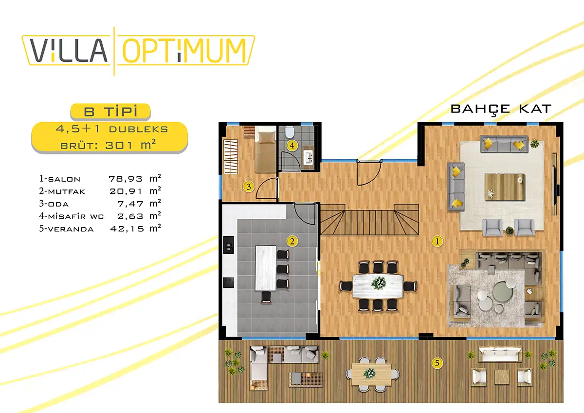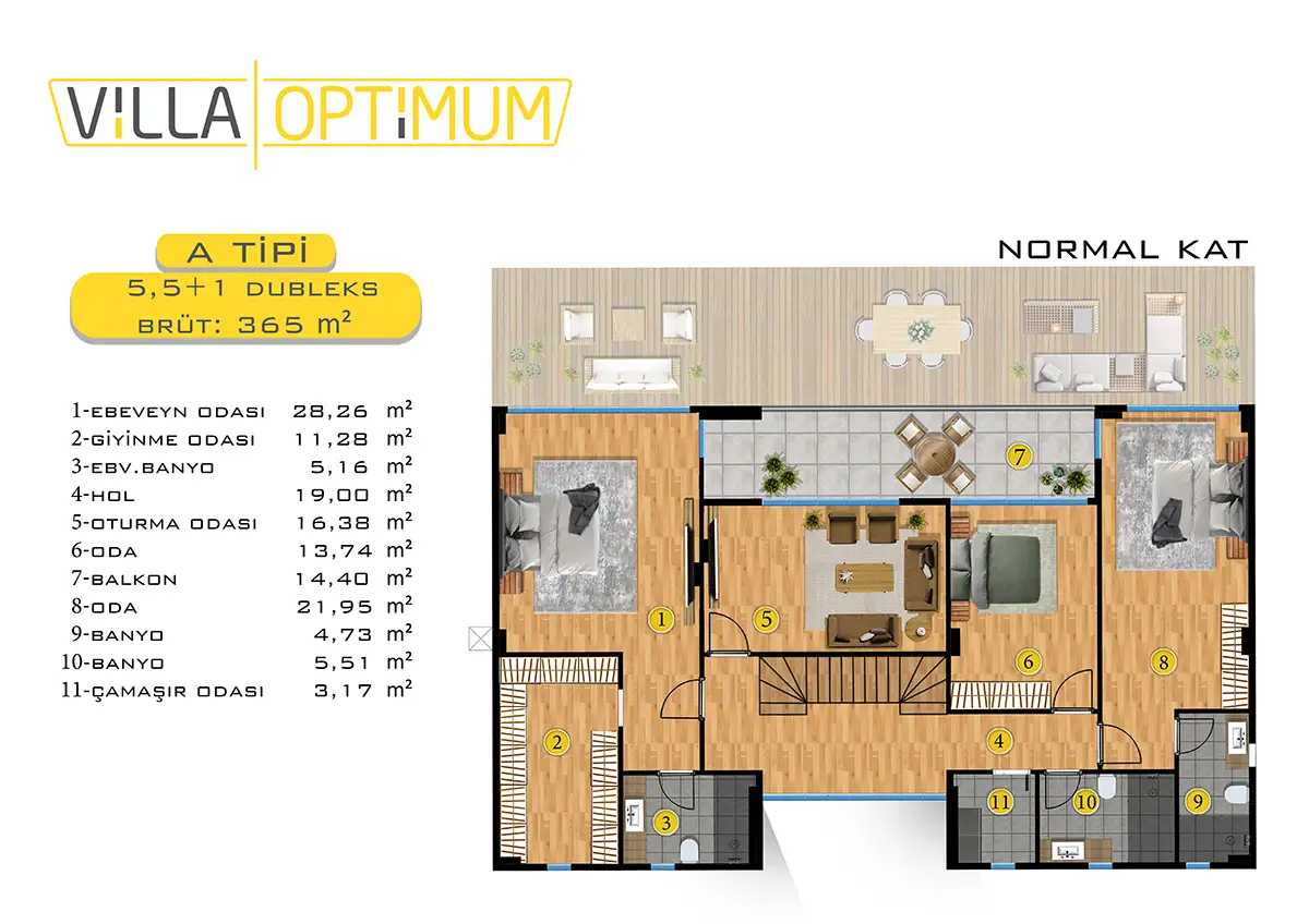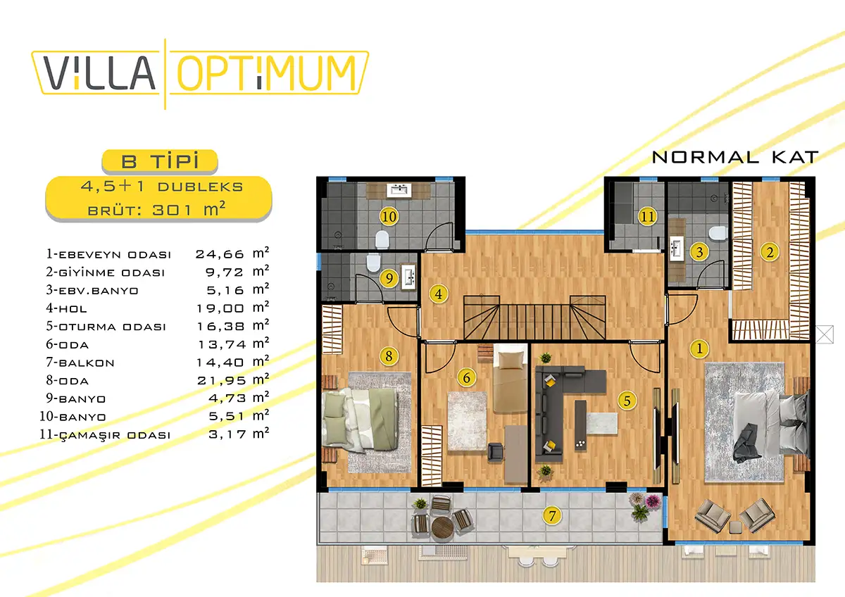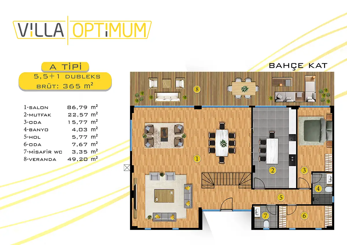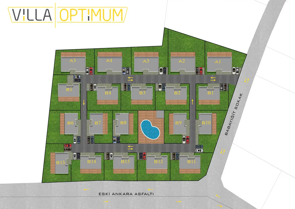 4,5+1 ve 5,5+1 seçeneklerinden oluşan Villa Optimum keşfedilmeye değer birçok güzelliğiyle 11 dönüm arazi üzerinde 20 adet villa ile sizleri bekliyor.