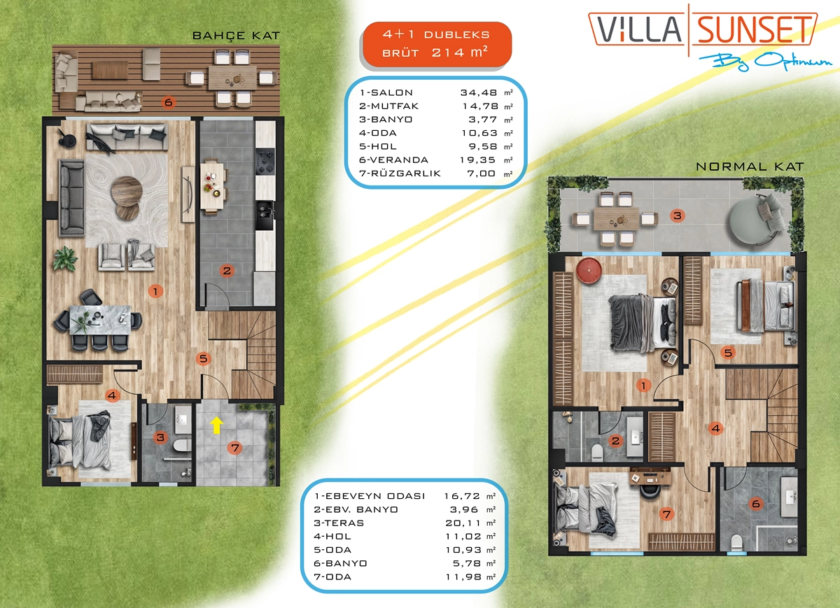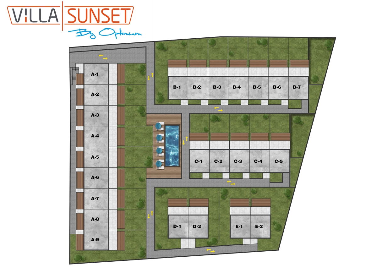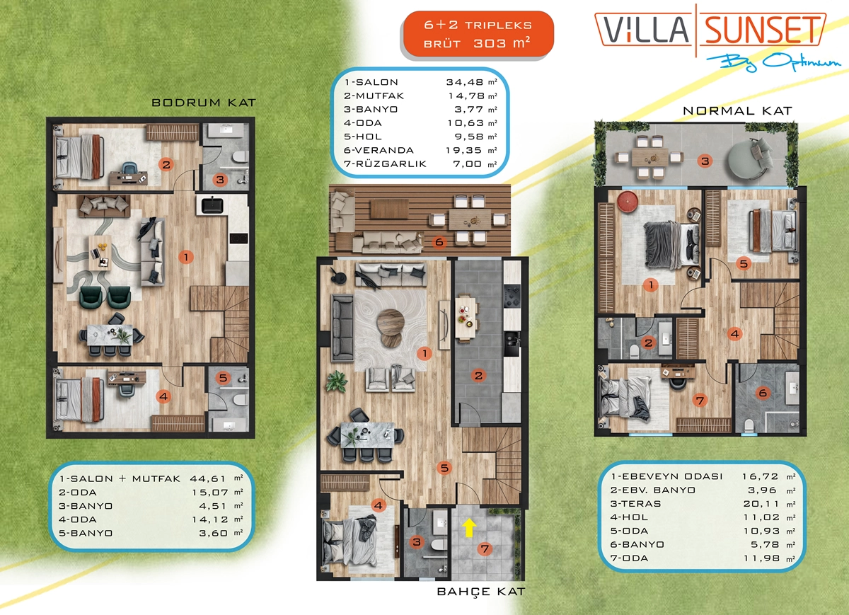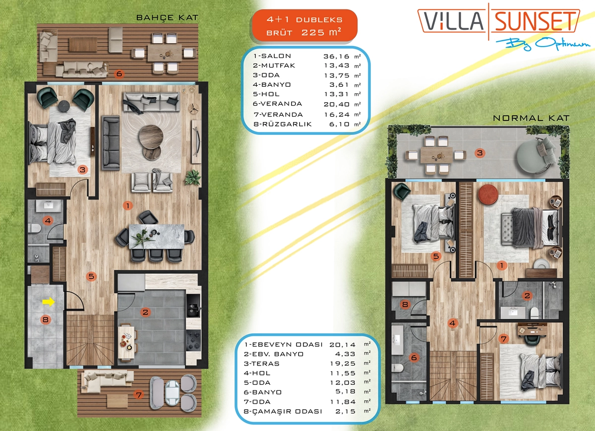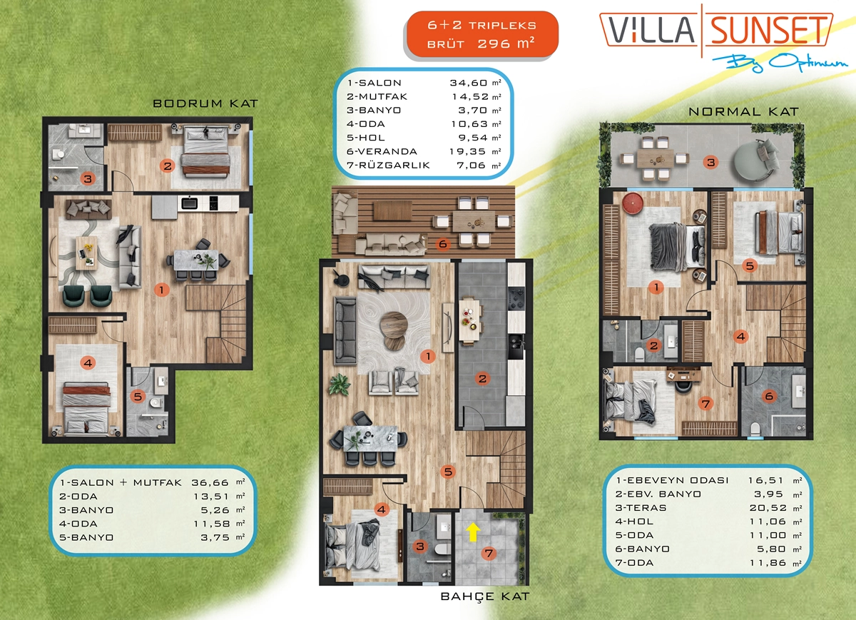 4 farklı villa tipi ile 25 özel villadan oluşan Villa Sunset, geniş yaşam alanları ve ayrıcalıklı detaylarıyla sizi bekliyor. 4+1 dubleks (214-225 m²) ve 6+2 tripleks (296-303 m²) seçenekleriyle modern yaşamın tüm konforunu sunuyor.