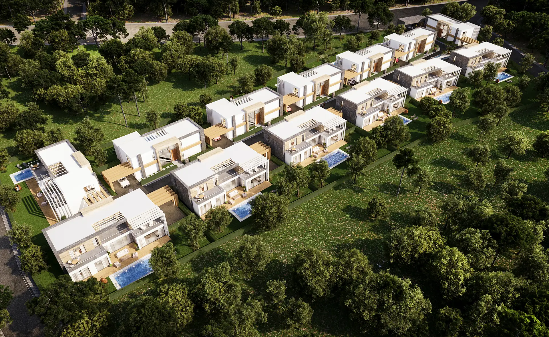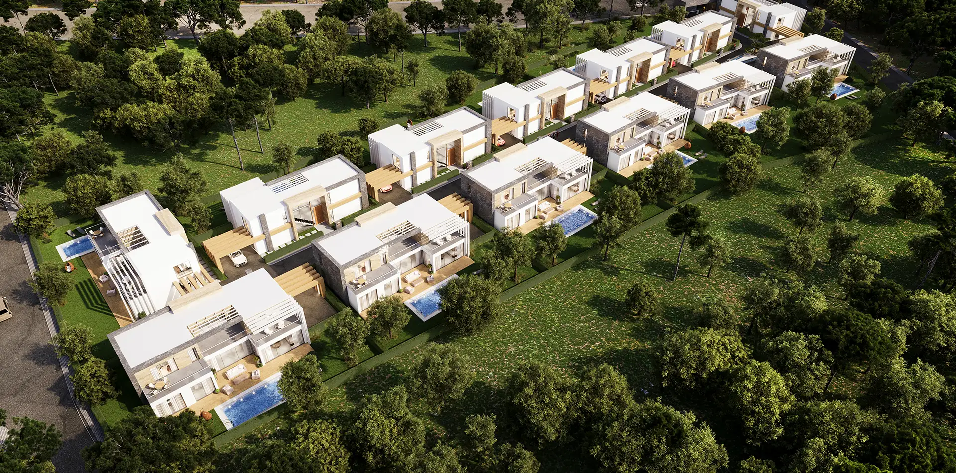 Tamamı 5+1 dubleksten oluşan 13 adet villa benzersiz tasarım ve mimarisi ile 10 dönümlük bir arazi üzerinde yer alıyor.